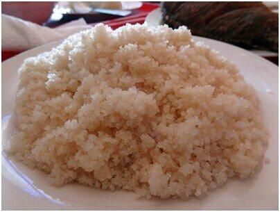 科特迪瓦最地道的主食自然是Attiéké,在網(wǎng)上找不到中文譯名。Attiéké簡單來說是把木薯捻碎了發(fā)酵成顆粒物的一種糧食,長相和口感都非常類似北非的小米飯古斯古斯,但是略有一點(diǎn)兒發(fā)酵的酸味,除此之外我覺得沒啥味道,個人不是太喜歡。