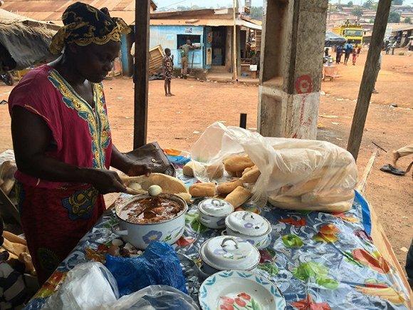 中餐講究醬料入味食材,西餐則是醬料與食材分離。所以西餐里衍生出了中餐里所沒有的醬汁體系。到了科特迪瓦,前面說過食材的做法都比較單一,所以醬汁就成為科特迪瓦人飲食習(xí)慣中非常重要的一環(huán)。尤其是當(dāng)?shù)厝送矚g把食材魚呀肉呀浸泡在非常濃厚的醬汁里吃,與中國人法國人的習(xí)慣都想去甚遠(yuǎn),大家可以通過以下一些圖片隨意感受一下。