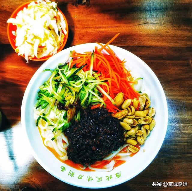 老北京炸醬面,要五花肉慢火炸醬,配上黃瓜絲。豆芽、芹菜等各種菜碼,再來(lái)幾瓣臘八蒜,一大碗管飽。專(zhuān)營(yíng)店能吃到,家家戶戶也都會(huì)做。(說(shuō)到這里,想起去韓國(guó)時(shí),導(dǎo)游說(shuō)他們統(tǒng)稱中國(guó)人叫“炸醬面”,雖然體現(xiàn)了我們的面食文化,但當(dāng)時(shí)也很不愛(ài)聽(tīng),給韓國(guó)導(dǎo)游一個(gè)差評(píng))。