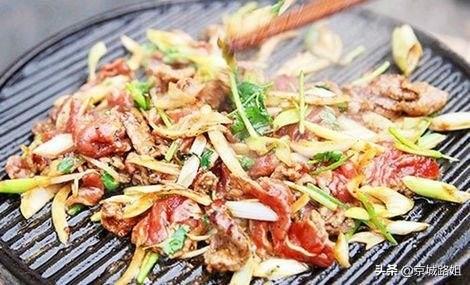 老北京炙子烤肉,烤的是羊肉,提前腌制好,要配上香菜、洋蔥和青椒,上鍋就熟,鮮嫩可口,滿嘴流油。
