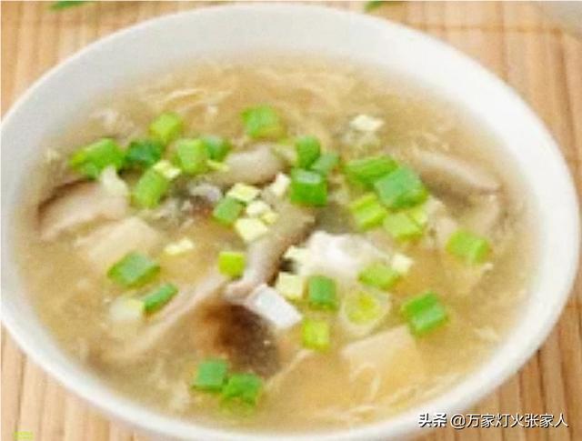 (3)起鍋燒油,油熱倒入蛋液,稍一定型,晃動鍋底,把它攤成蛋餅,剛一凝固,翻面,用勺子把蛋餅打散成小塊,快速沖入熱水,加蓋燜煮五分鐘(這里可加入些海米會更加美味),五分鐘后打開鍋蓋,湯已經(jīng)又白又濃,這時把海鮮菇,白菜葉和粉絲倒入,加入鹽5克,胡椒粉3克,糖少許調(diào)味,再燉煮兩分鐘入味即可,好喝的三鮮湯就做好了。