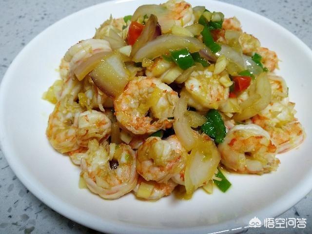 3、再將蝦仁、蒜末、姜末、蔥段倒進(jìn)去,加料酒快速的和洋蔥片翻炒入味即可。