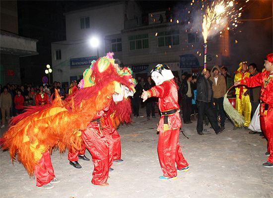 不知什么時候,人們忽然喧嚷開來,并紛紛讓出一道:哦!原來是舞龍(也稱玩龍燈)大戲從街上隆重入場表演了!紅色的紙龍,扎得惟妙惟肖,一精壯者手持棍上繡球舞動,吸引龍頭,其意欲奪龍嘴寶珠。一干小伙子赤膊上陣,撐起龍身,上下左太起伏搖動;扛龍頭自然是好把式,而據(jù)說關(guān)鍵在于擺龍尾的才是老大:他指揮著龍身的騰挪、位置變動,與龍頭渾然一體,銜接成完美而靈動的活龍。