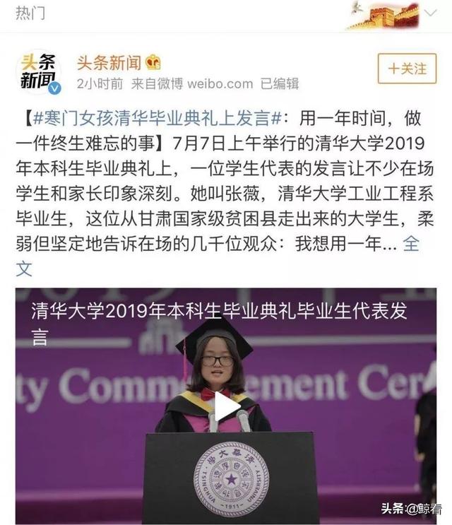 微博被熱搜“清華寒門女孩畢業(yè)典禮刷屏”,7月7日的清華大學(xué)2019年本科生的畢業(yè)典禮上,一位學(xué)生代表的發(fā)言讓不少在場的學(xué)生和家長印象深刻。這位從甘肅國家級貧困縣走出來的大學(xué)生,柔弱但堅(jiān)定的告訴在場的幾千位觀眾,我想用一年不長的時(shí)間,做一件終生難忘的事。