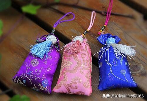 端午節(jié)小孩佩香囊,傳說有避邪驅(qū)瘟之意,實際是用于襟頭點綴裝飾。香囊內(nèi)有朱砂、雄黃、香藥,外包以絲布,清香四溢,再以五色絲線弦扣成索,作各種不同形狀,結(jié)成一串,形形色色,玲瓏可愛。
